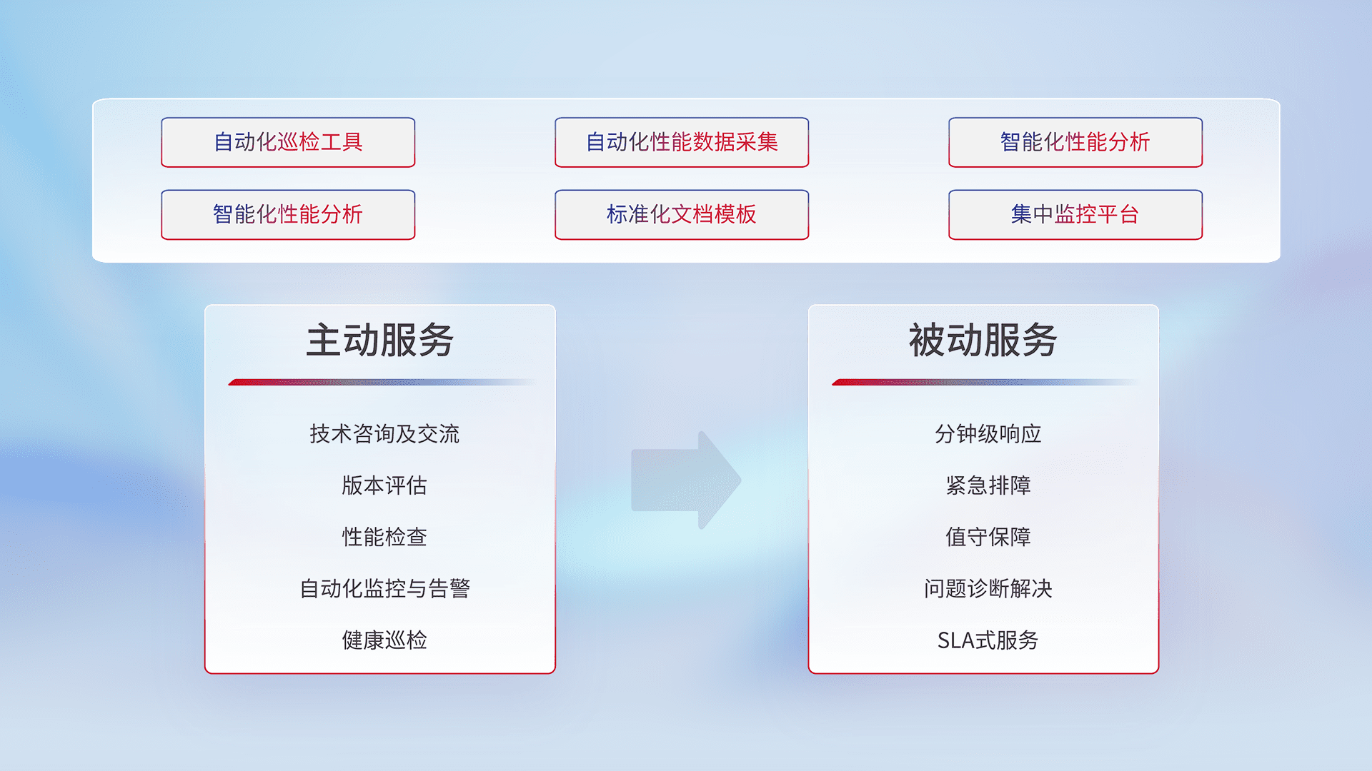 智能化工具和标准化文档,,,保障服务质量,,,,提供主动服务(包含技术咨询、、、版本评估、、、、性能检查、、、、自动化监控与告警、、健康巡检)和被动服务包含(分钟级响应、、、、紧急排障、、值守保障、、问题诊断解决、、、SLA服务)。。。